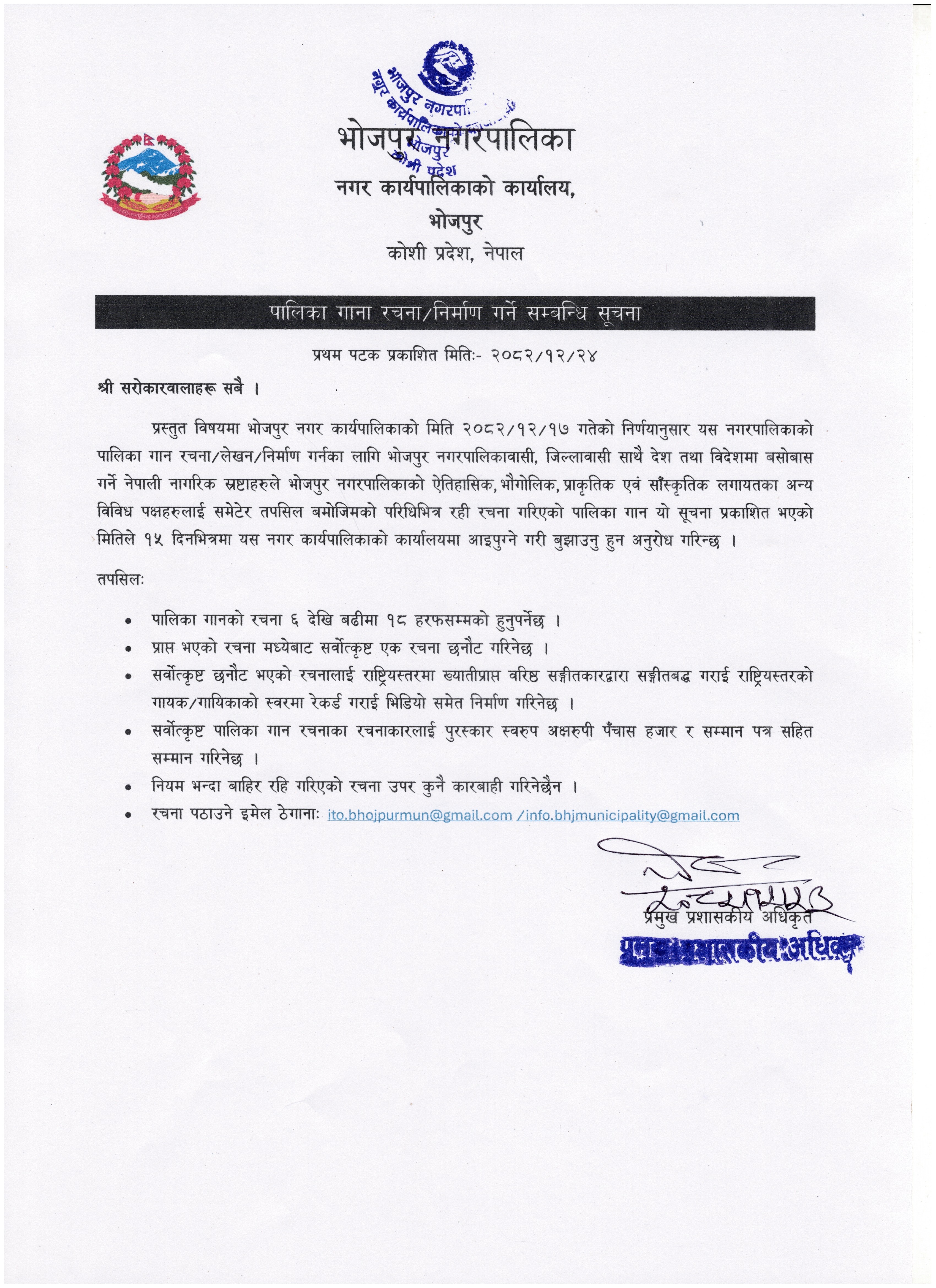 पालिका गाना रचना/निर्माण गर्ने सम्बन्धि सूचना