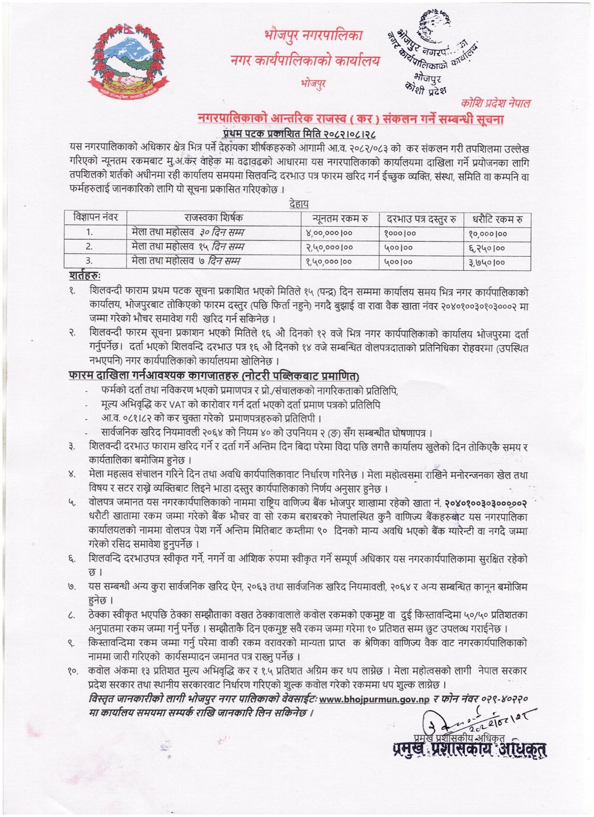 भाेजपुर नगरपालिकामा मेला तथा महोत्सव सञ्चालनका लागि आन्तरिक राजश्व (कर) संकलन गर्ने सम्बन्धि सूचना