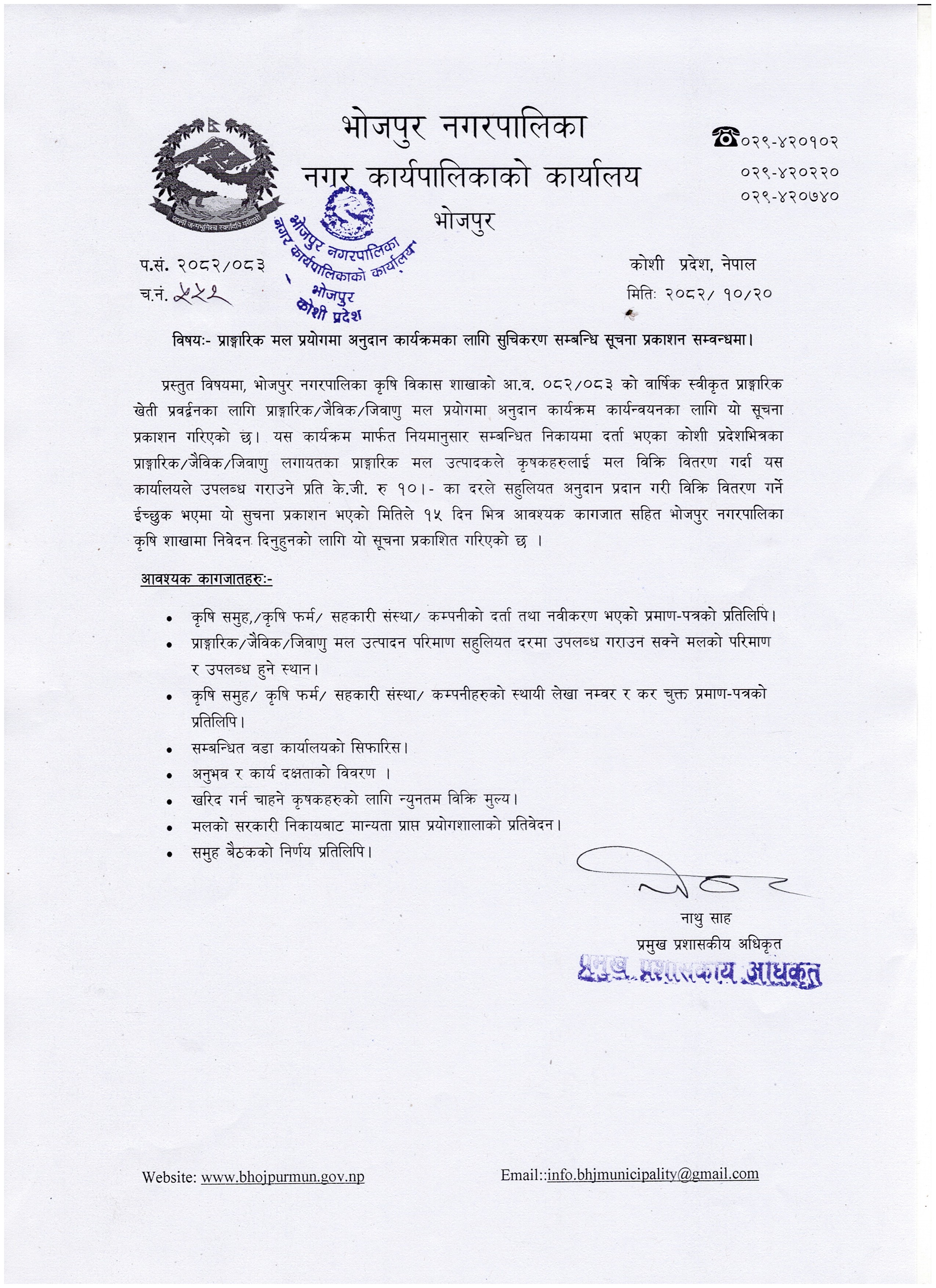 प्राङ्गारिक मल प्रयोगमा अनुदान कार्यक्रमका लागि सुचिकरण सम्बन्धि सूचना प्रकाशन सम्बन्धमा ।